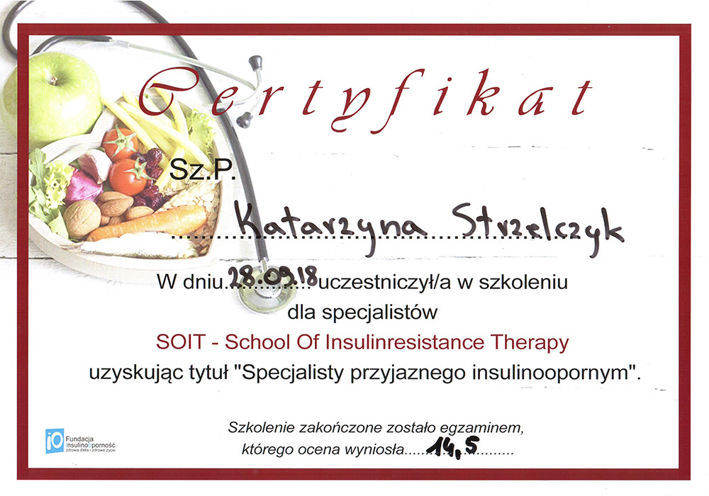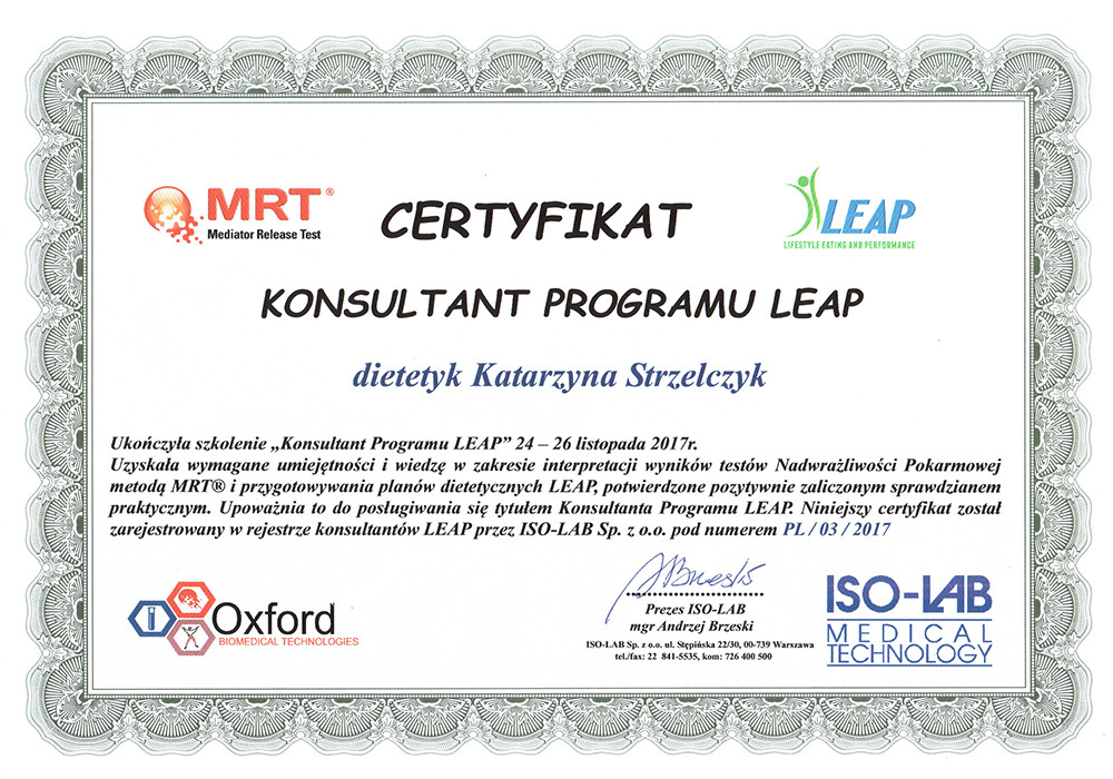 W listopadzie 2017 r uzyskałam uprawnienia do analizy i interpretacji testów na Nadwrażliwość pokarmową MRT. Przeprowadzam pacjentów przez cały proces eliminacji, pokarmów które wywołują stan zapalny w organizmie. Testy wykonałam dzieciom i sobie. Dzięki temu wiem, co to znaczy być na diecie eliminacyjnej, jakie to trudne i jak Ci pomóc.